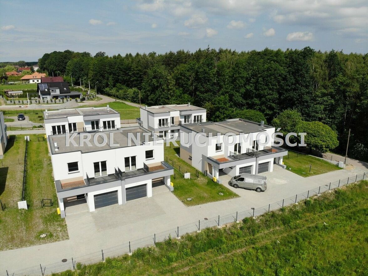 Dom sprzedawany jest w standardzie deweloperskim obejmującym ogrzewanie podłogowe na obu kondygnacjach oraz w garażu, piec gazowy kondensacyjny, komplet instalacji wodno-kanalizacyjnych, elektrycznych i gazowych, instalację internetową oraz alarmową, tynki, wylewki, okna PCV, drzwi wejściowe antywłamaniowe oraz bramę garażową sterowaną pilotem. Wykonana elewacja i ogrodzenie podkreślają spójny charakter całej inwestycji.
