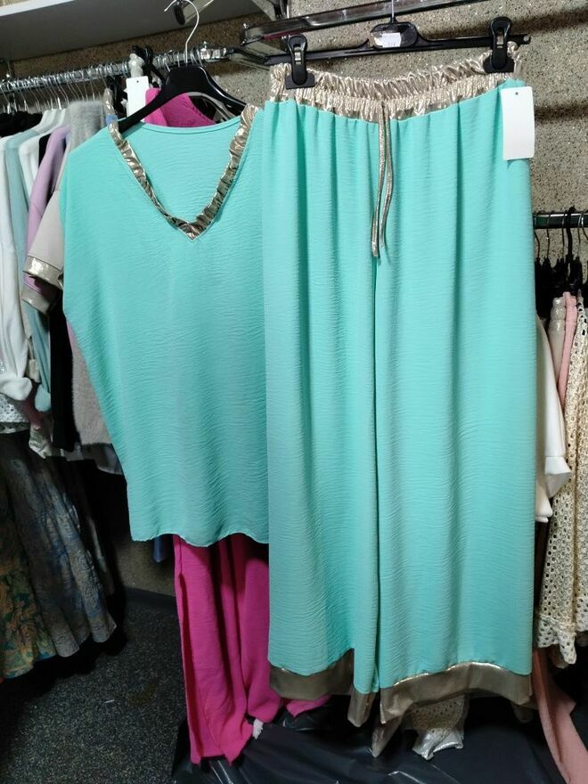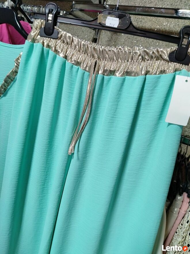 Postaw na modę i komfort! Nasz komplet damski składa się z luźnej bluzki z krótkim rękawem oraz szerokich spodni z lekkiego, przewiewnego materiału.Spodnie z gumką w pasie
