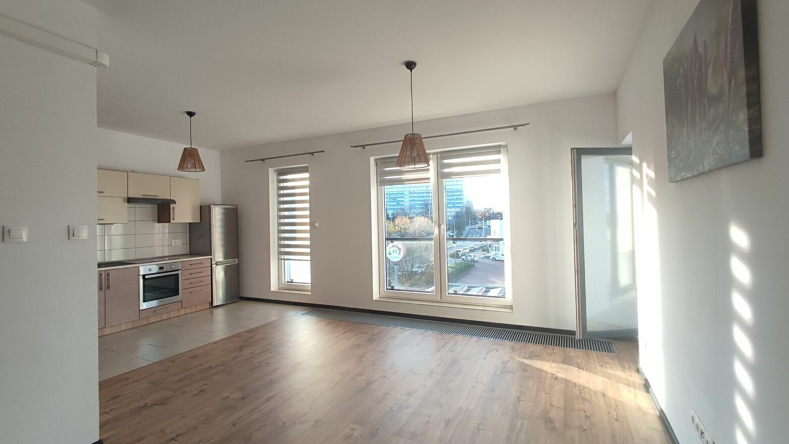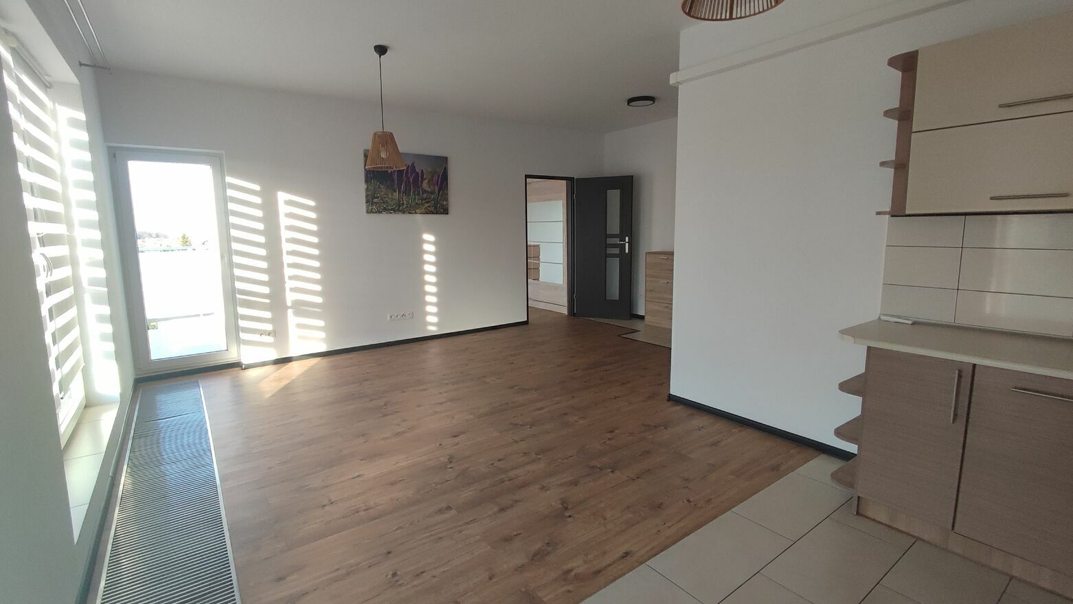 Przestronny salon z aneksem kuchennym i wyjściem na balkon.