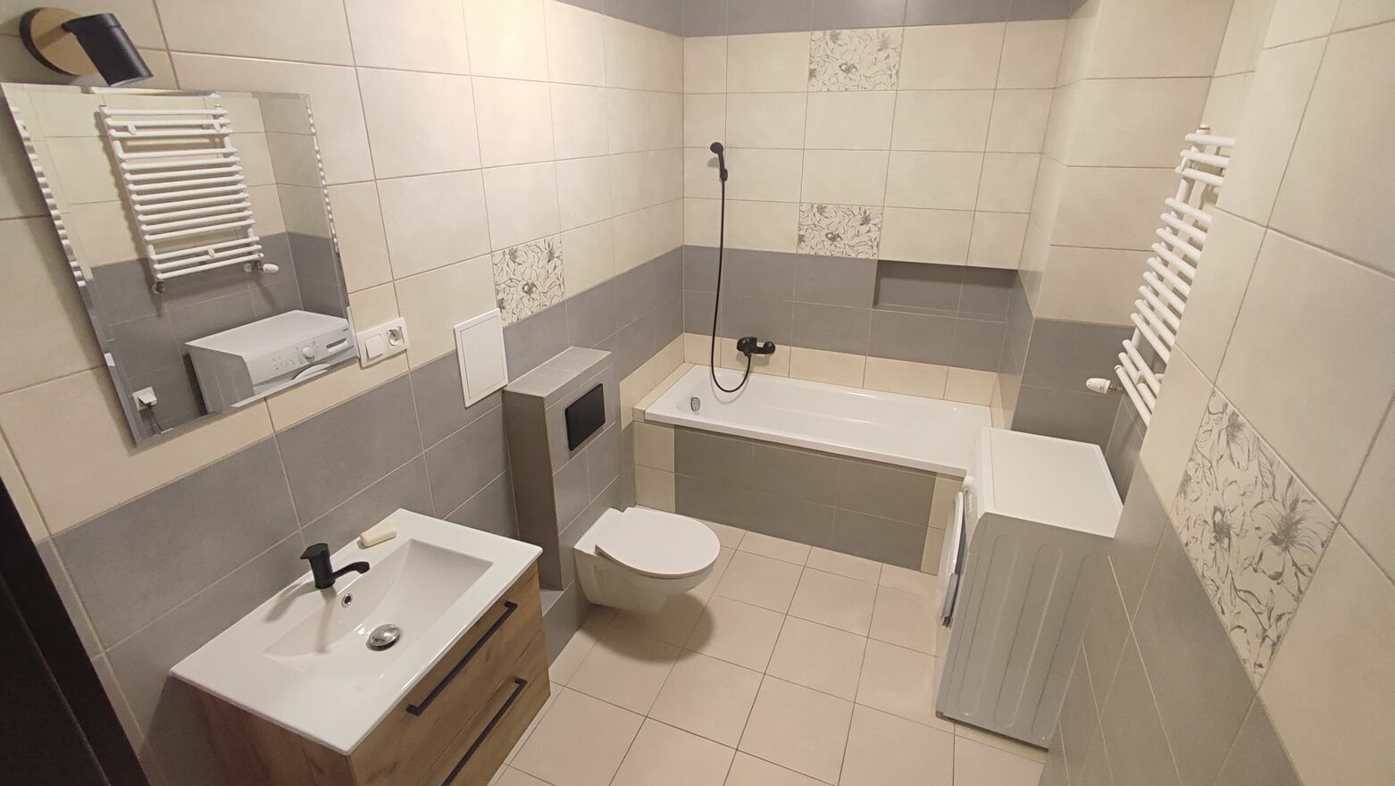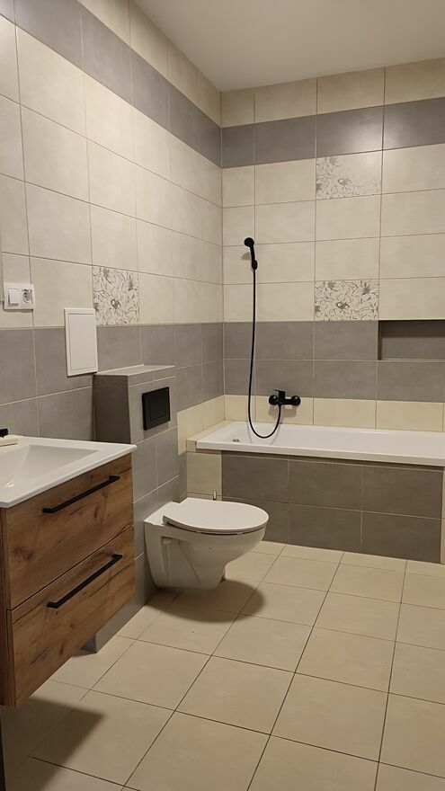 Łazienka z wanną, nową szafką oraz armaturą, nowa pralka na wyposażeniu.