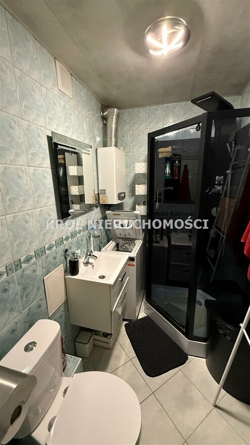 Łazienka w całości wykafelkowana, wyposażona w kabinę prysznicową.