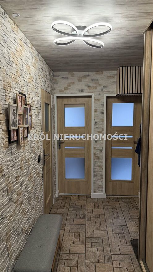 Na podłogach znajdują się panele, natomiast w przedpokoju kafelki oraz efektowny kamień dekoracyjny na ścianach.