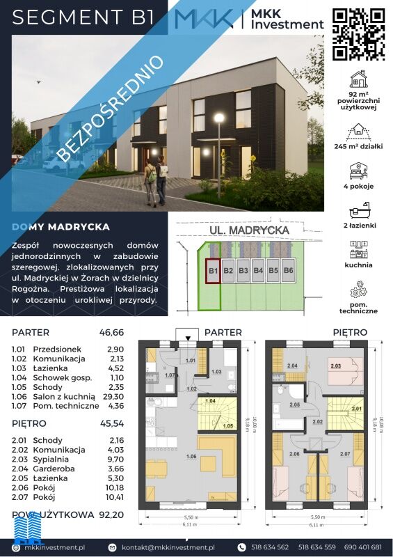 Nowoczesny dom w spokojnej dzielnicy Żory-Rogoźna — tylko 6 segmentów w kameralnej zabudowie przy ul. Madryckiej. Dom o powierzchni 92m², 4 pokoje, własny ogród i miejsce parkingowe. Ogrzewanie podłogowe, płaski dach przygotowany pod fotowoltaikę, duże przeszklenia.TWOJE OSZCZĘDNOŚCI NA START: